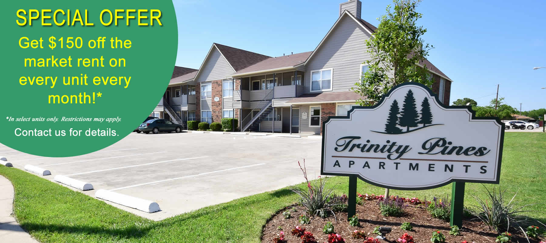 At Trinity Pines, you'll enjoy features and amenities including completely updated exteriors designed to make life just a little more care-free! Trinity Pines is nestled within a quiet neighborhood location with trees and open green spaces, ideal for families and pets!
